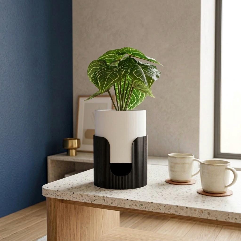 Elevate your plants — and your space — with the Ribbed Cradle Planter, a sculptural two-piece design that blends modern structure with practical plant care. The elevated cradle base lifts the planter, creating an open, airy silhouette that adds depth and dimension to any surface.
